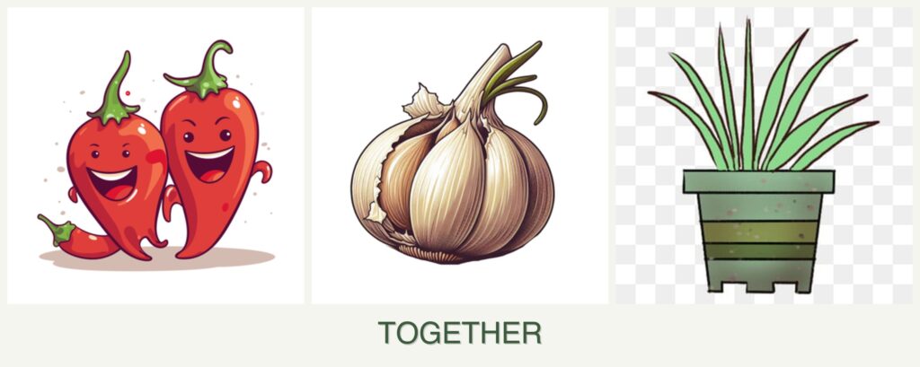 - Pest Repellent Properties: Garlic’s sulfur compounds deter aphids and other pests, protecting peppers and lemongrass.