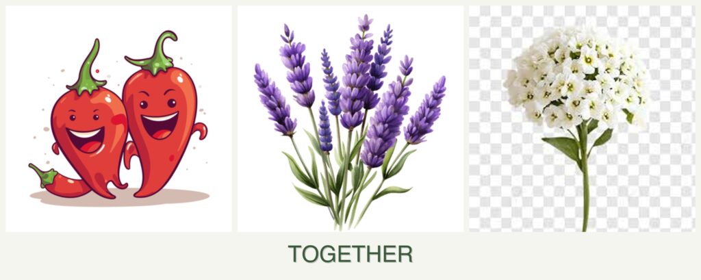 - Growth Requirements: Peppers and alyssum share similar sunlight needs, while lavender’s drought tolerance can be managed with strategic placement.