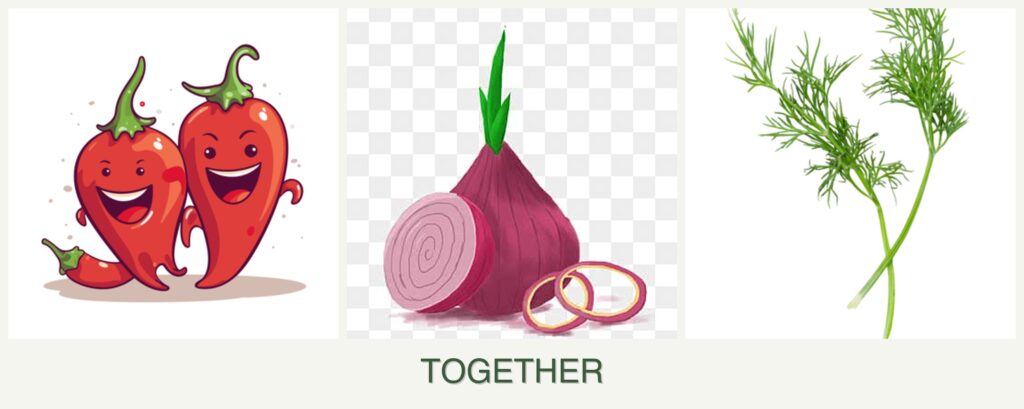 - Growth Requirements: Peppers and onions both thrive in full sun and well-drained soil. Dill also prefers similar conditions, making them compatible in terms of sunlight and soil needs.