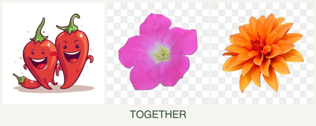 - Growth Requirements: Peppers need full sun and warm temperatures, similar to petunias and dahlias.