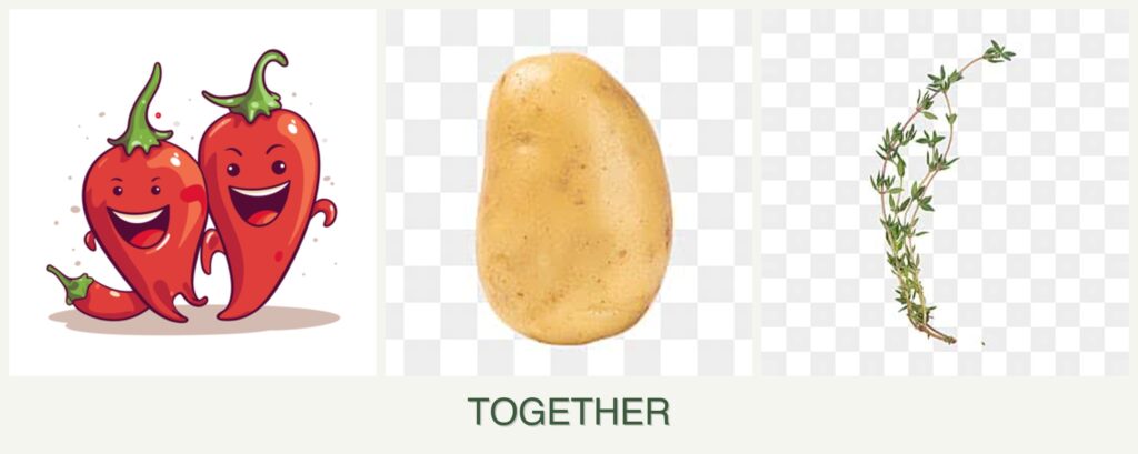 - Timing: Plant potatoes in early spring, peppers after the last frost, and thyme anytime during the growing season.