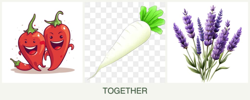 - Space Efficiency: Radishes grow quickly and can be harvested before peppers and lavender fully mature, making efficient use of garden space.