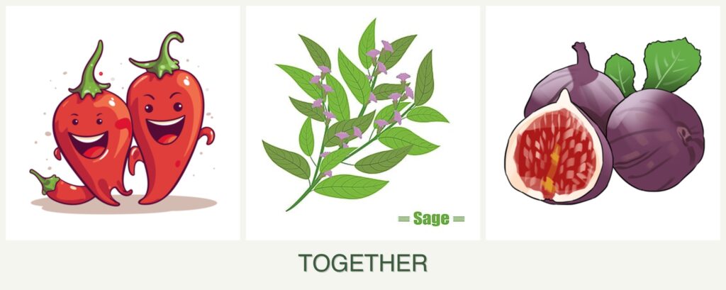 Growth Requirements: Peppers and sage thrive in similar conditions, preferring full sun and well-drained soil. Figs also need full sun but require more space and deeper soil.