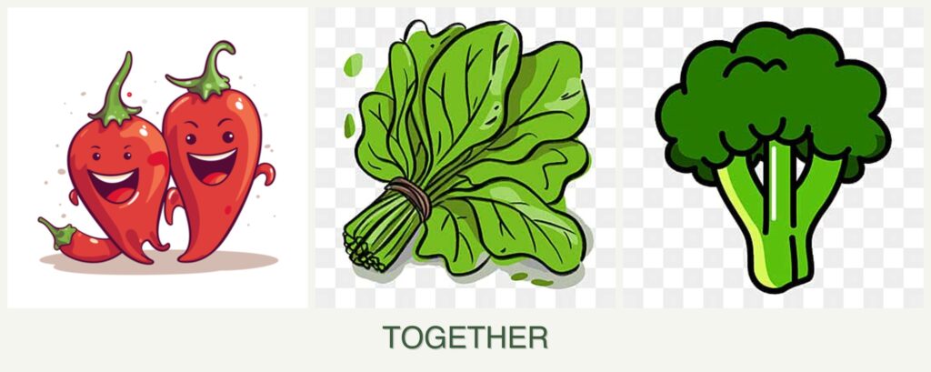 - Growth Requirements: Peppers need full sun, while spinach and broccoli can tolerate partial shade. Peppers and broccoli require similar nutrient-rich soil, whereas spinach is less demanding.