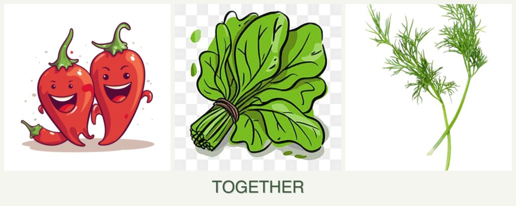 Peppers and dill can benefit from being planted together because dill attracts beneficial insects that can help control pepper pests. Spinach, with its shallow roots, won’t compete heavily with peppers and dill for nutrients.