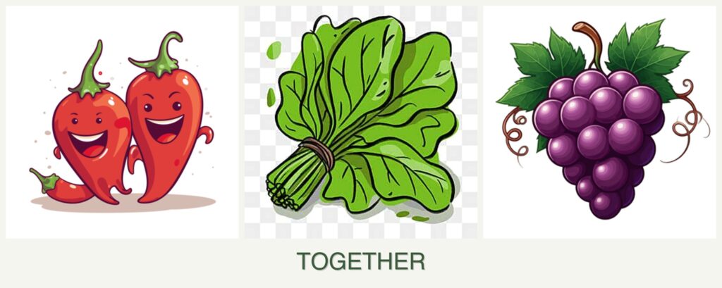 - Competition for Resources: Grapes, being heavy feeders, might deplete soil nutrients, affecting peppers and spinach.