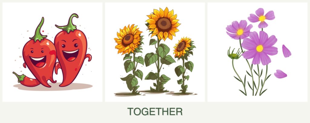 Sunflowers can act as a trap crop for aphids, drawing them away from peppers. Cosmos attract beneficial insects like bees and butterflies, which can aid in pollination. All three plants have similar nutrient needs, but it’s crucial to ensure adequate spacing to prevent competition.