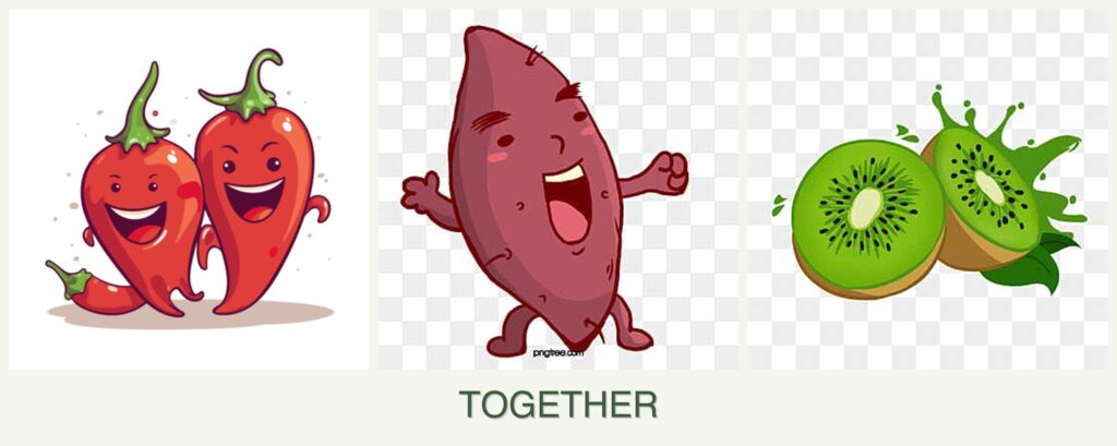 - Growth Requirements: Peppers and sweet potatoes have similar light needs but differ in soil and space requirements. Kiwi’s climbing nature and support needs differ significantly.