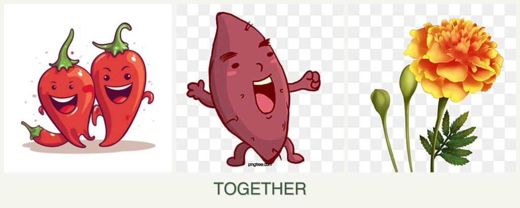 Planting peppers, sweet potatoes, and marigolds together offers several advantages: