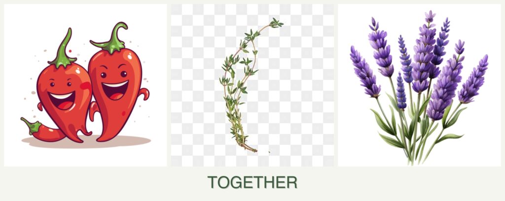 - Competition for Resources: Peppers need more nutrients than thyme and lavender, which could lead to competition if not managed.
