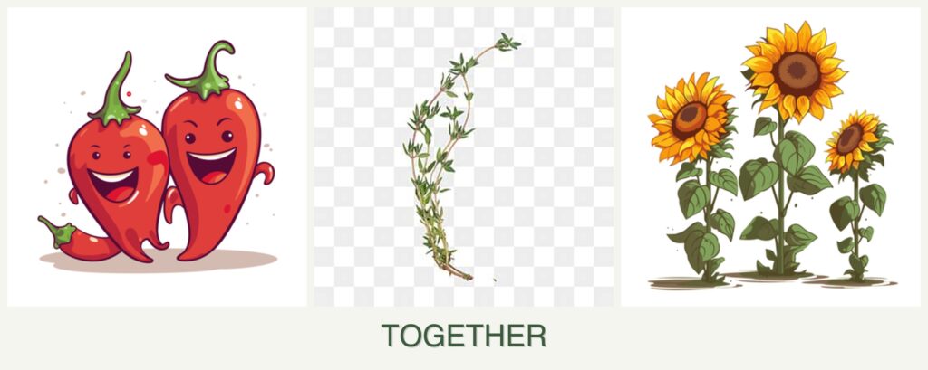 - Pest Control: Thyme is known for its pest-repelling properties, which can benefit peppers. Sunflowers attract pollinators, which can aid in the growth of both thyme and peppers.