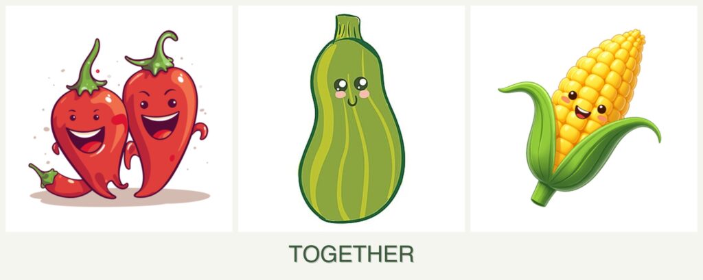 - Corn grows tall, providing natural support and partial shade, which can benefit peppers and zucchini during intense heat.