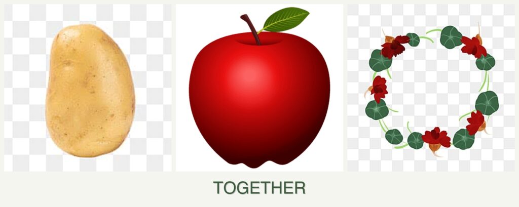 - Growth Requirements: Potatoes and nasturtiums have similar sun and water needs, whereas apples require more room and specific pruning.
