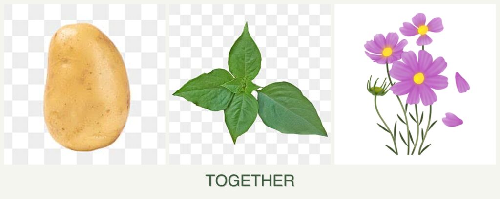 - Resource Competition: Potatoes’ high nutrient needs may compete with basil and cosmos.