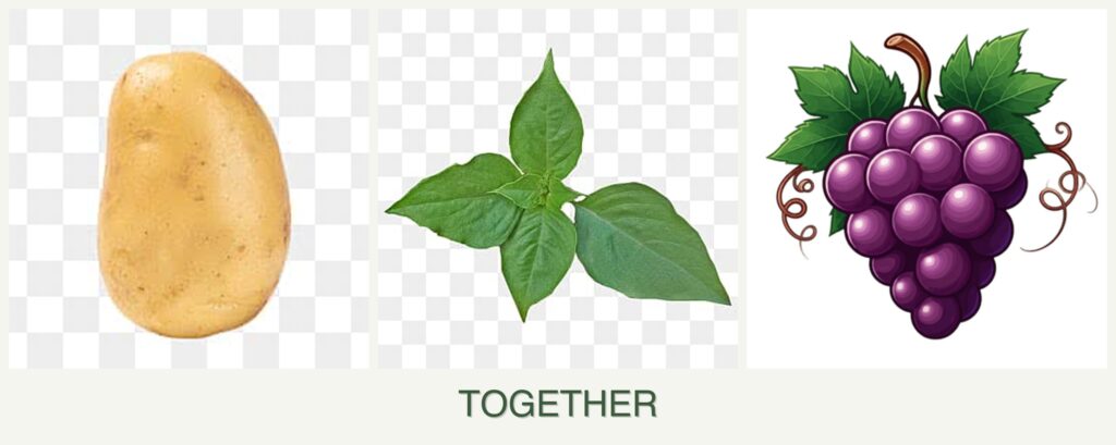 - Competition for Resources: Grapes can overshadow and compete for nutrients and water with potatoes and basil.