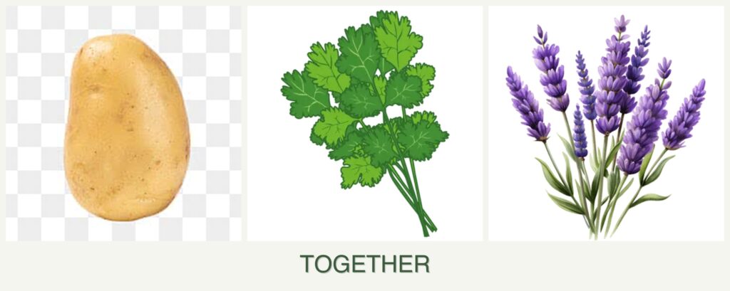 Pest Control: Lavender is known for its pest-repelling properties, which can benefit potatoes by deterring pests like aphids. Cilantro can attract beneficial insects such as ladybugs, which help control pests naturally.