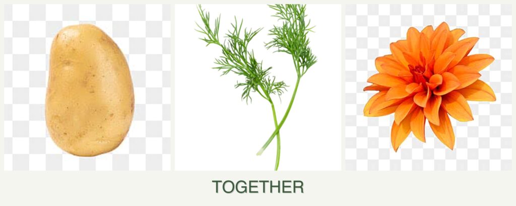 - Growth Requirements: Dill and dahlias share similar sunlight and soil needs, while potatoes require more space and specific soil types.