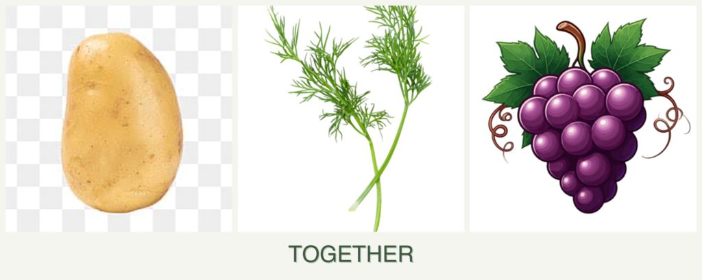 - Pest Control: Dill can attract beneficial insects that help control pests affecting potatoes. However, grapes and potatoes do not share similar pest deterrents.
