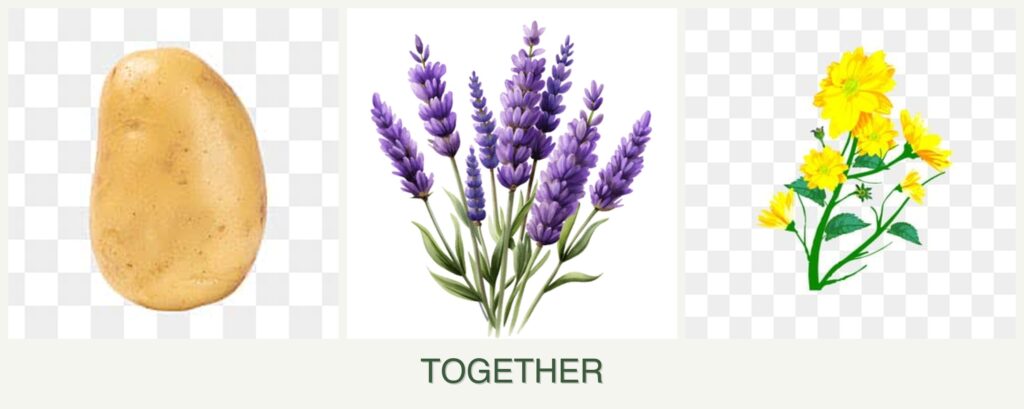 - Optimal Spacing: Plant potatoes 12-15 inches apart, lavender 18-24 inches apart, and calendula 8-12 inches apart.