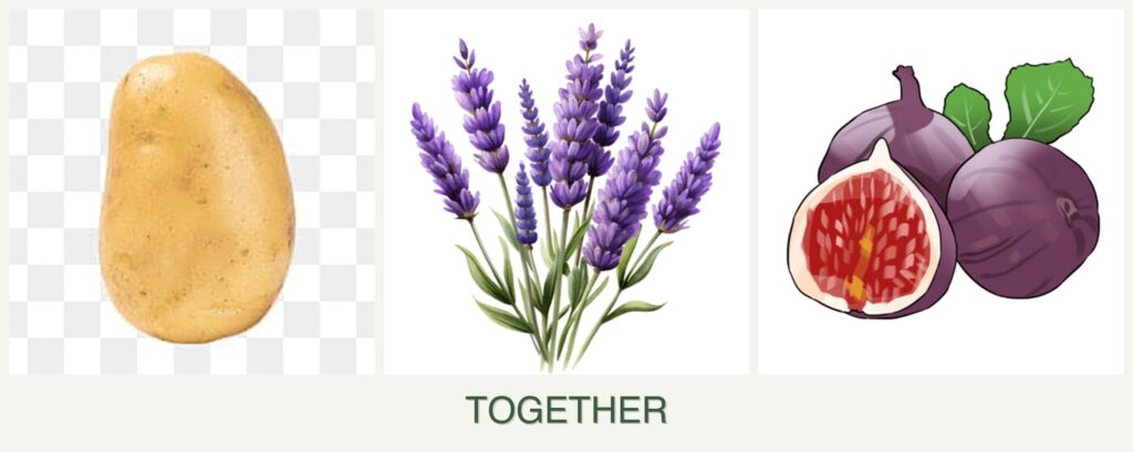 - Timing: Plant potatoes in early spring, lavender in late spring, and figs in early spring or fall, depending on your climate.