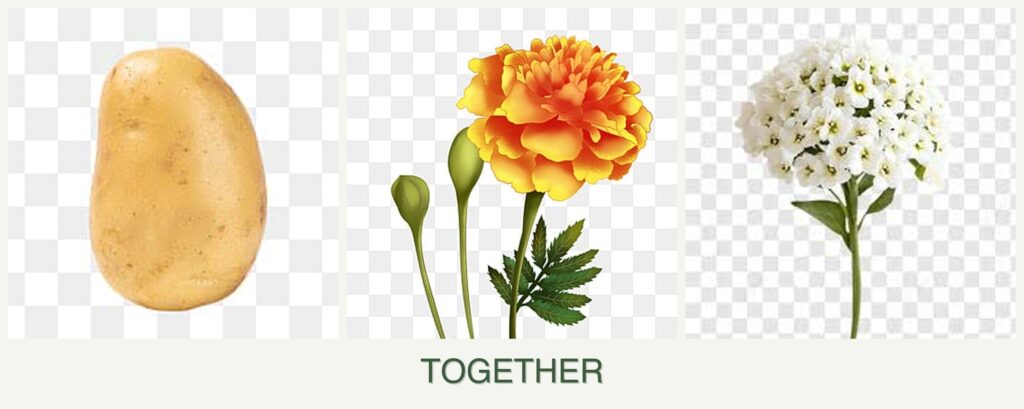 Growth Requirements: Potatoes prefer full sun and well-drained soil, conditions that marigolds and alyssum also thrive in. Marigolds are known for their pest-repelling properties, particularly against nematodes that can damage potato roots. Alyssum, a low-growing plant, helps conserve moisture and suppress weeds around taller plants like potatoes.