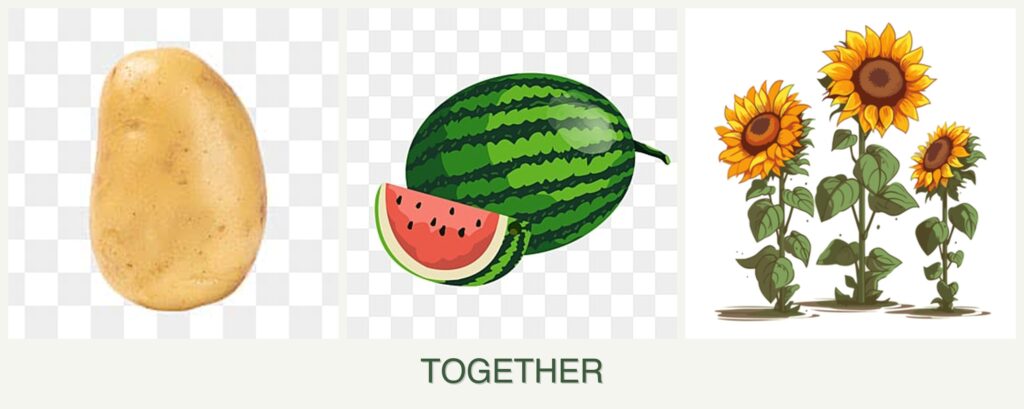 Nutrient Needs and Spacing: Potatoes are heavy feeders that compete for nutrients, which can deprive melons and sunflowers of the resources they need. Moreover, the sprawling nature of melon vines can overshadow potatoes, limiting their access to sunlight.