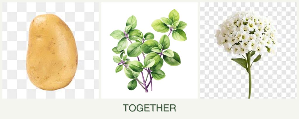 - Competition for Resources: Potatoes are heavy feeders, which might compete with oregano and alyssum for nutrients.