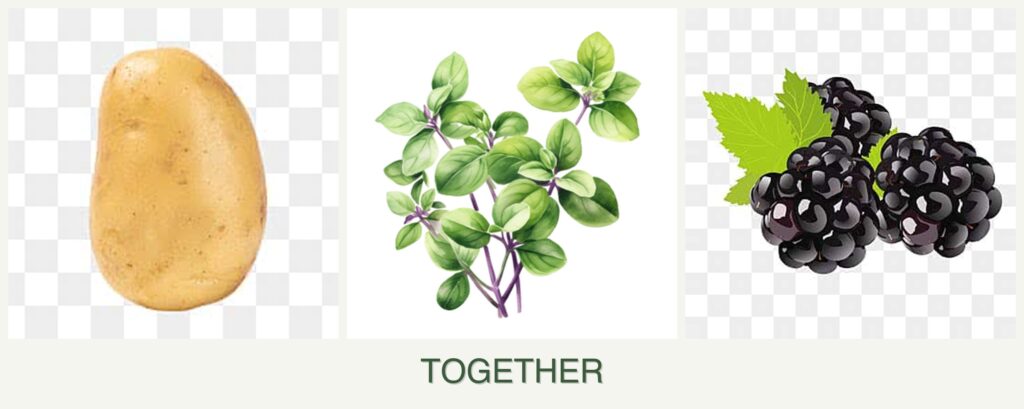 - Growth Requirements: Potatoes and oregano can share similar soil conditions, but blackberries need more space and support.