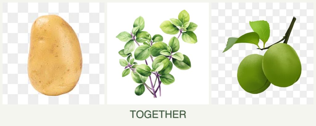 - Spacing: Potatoes need room to spread underground, oregano spreads as a low-growing herb, and plums need significant space for their root systems and canopy.
