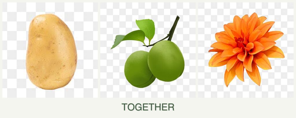 Growth Requirements: Potatoes need full sun and well-drained soil, while plums prefer slightly acidic soil and full sun. Dahlias also thrive in full sun with rich, well-drained soil. Their growth conditions align, making them compatible in terms of sunlight and soil type.