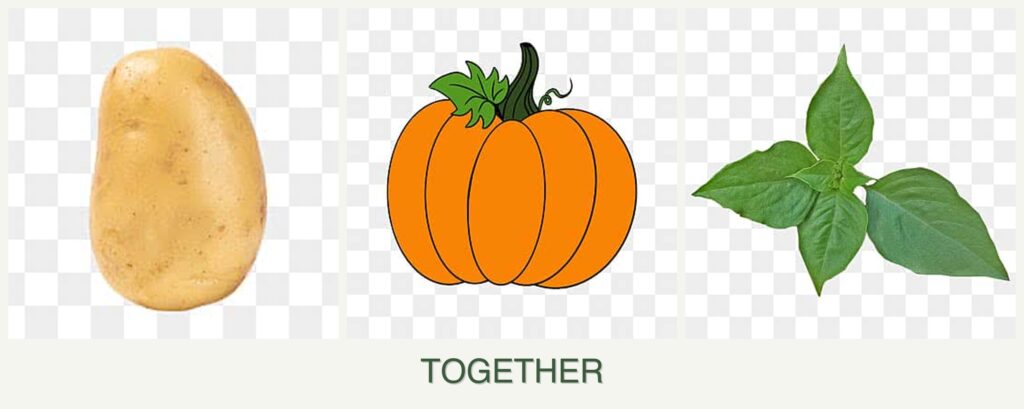 - They should not be planted together, but individually, potatoes in early spring, basil after the last frost, and pumpkins when the soil is warm.
