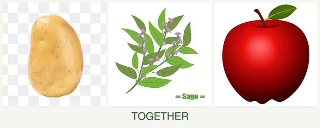 Growth Requirements: Potatoes prefer well-drained soil and full sun. Sage thrives in similar conditions, requiring full sun and well-drained soil. Apples also need full sun but require more space and deeper soil for their root systems.