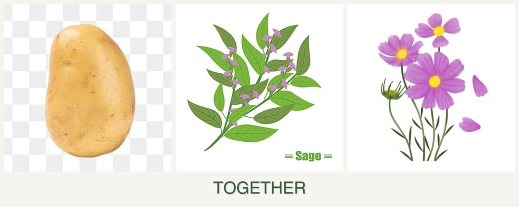 - Growth Requirements: Sage and cosmos thrive in similar conditions, but potatoes need more space and nutrients.
