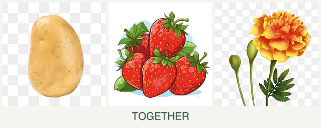 - Growth Requirements: All three plants have similar sunlight needs, thriving in full sun conditions. They also prefer well-drained soil, though strawberries and marigolds can tolerate slightly acidic conditions better than potatoes.