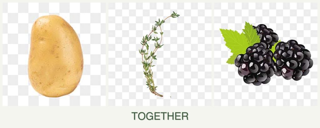 - Growth Requirements: Potatoes and thyme can share similar soil conditions, but blackberries need more space and support.