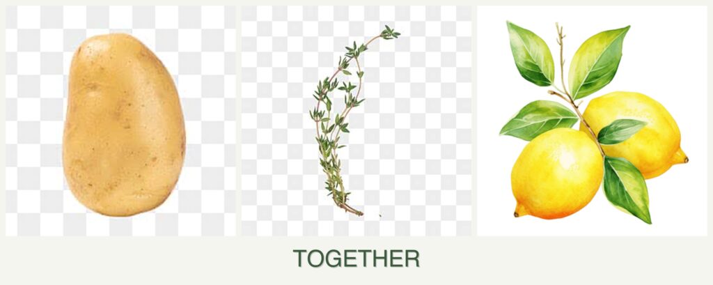 - Companion Plants: Potatoes pair well with beans and corn, thyme with rosemary and sage, and lemons with basil and marigolds.