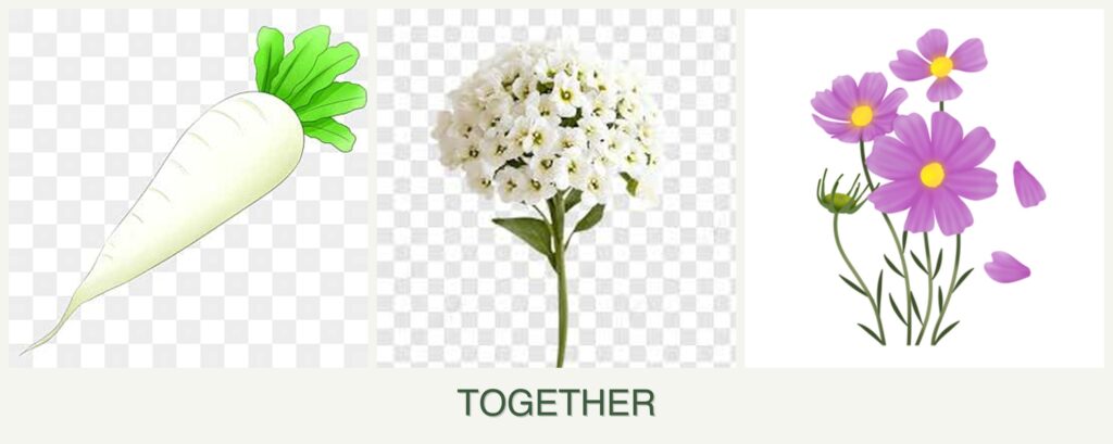 Pest Control: Alyssum attracts beneficial insects like hoverflies and ladybugs, which prey on aphids and other pests that might affect radishes. Cosmos, with its tall, airy structure, can provide some shade and protection for radishes from intense sun and pests.