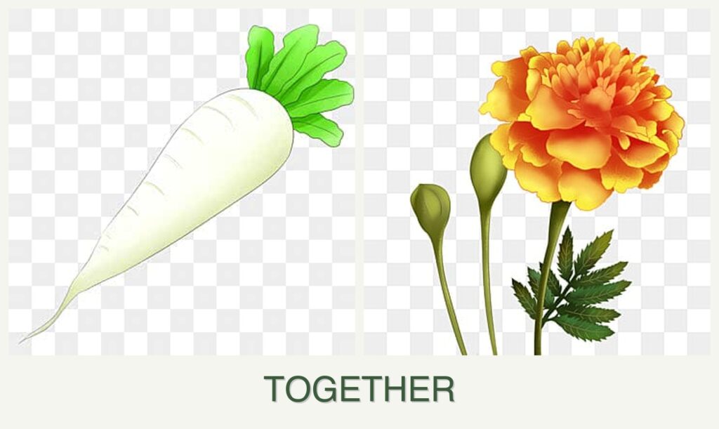 - Pest Control: Marigolds deter pests that could harm radishes.