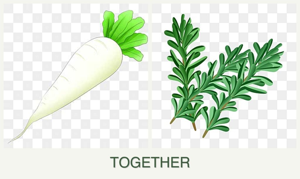 - Avoid planting rosemary with moisture-loving plants; radishes should not be near large, root-heavy plants.