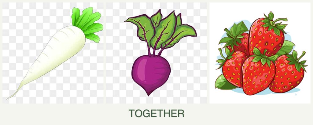 - Growth Requirements: Radishes and beets are root vegetables that thrive in similar soil conditions, while strawberries are low-growing plants that prefer slightly different conditions but can coexist if spaced correctly.