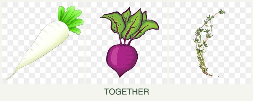 Yes, you can plant radishes, beets, and thyme together. These plants complement each other in several ways, making them suitable companions in the garden. Radishes and beets share similar growth requirements, such as full sun and well-drained soil, while thyme, a hardy herb, can thrive alongside them without competing for resources. Thyme’s aromatic properties can repel pests that might otherwise target radishes and beets, providing a natural form of pest control. Additionally, thyme’s low-growing habit allows it to fit well among root vegetables, optimizing space.