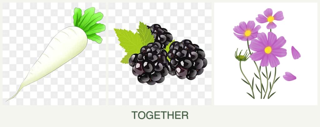 - Soil Health Benefits: Radishes help prevent soil compaction, benefiting the root systems of blackberries and cosmos.