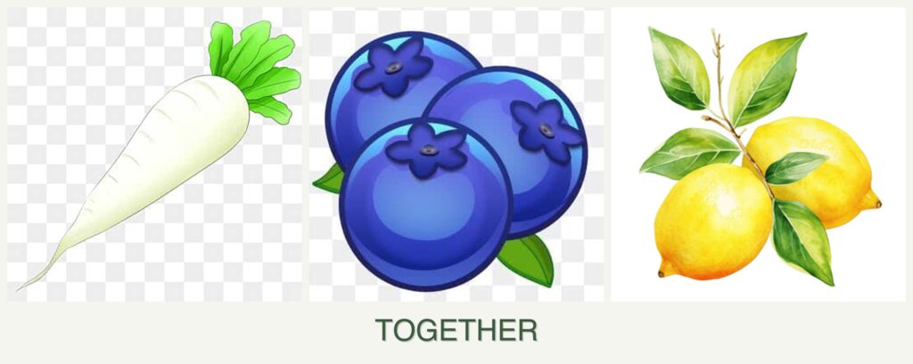 - Pest Repellent Properties: Radishes can deter some pests, but blueberries and lemons do not gain significant benefits.