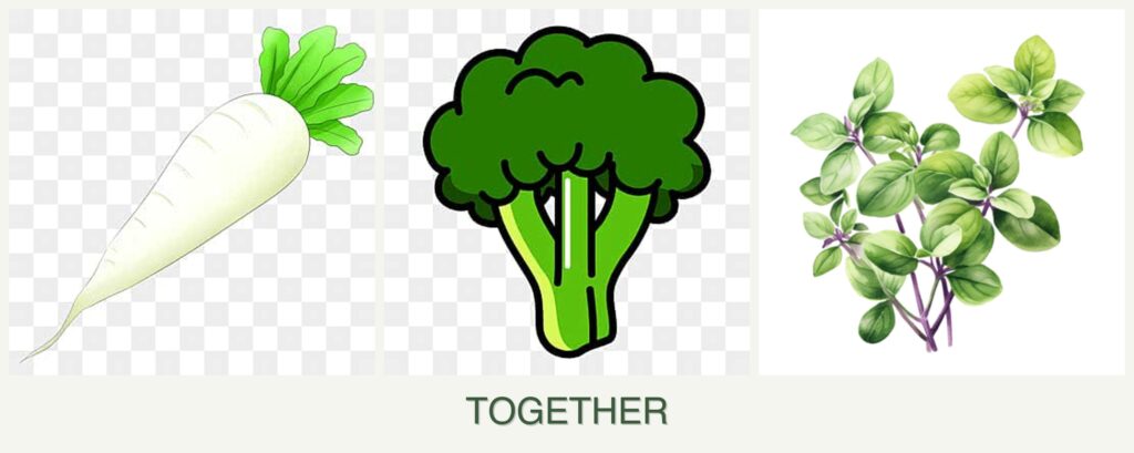 Pest Control: Oregano is known for its aromatic leaves, which can deter pests that might otherwise target broccoli. Radishes serve as a trap crop for flea beetles, protecting broccoli from damage.