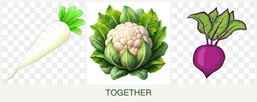 - Nutrient Needs: These plants have complementary nutrient requirements, with radishes and beets benefiting from the nutrients released by cauliflower as it breaks down.