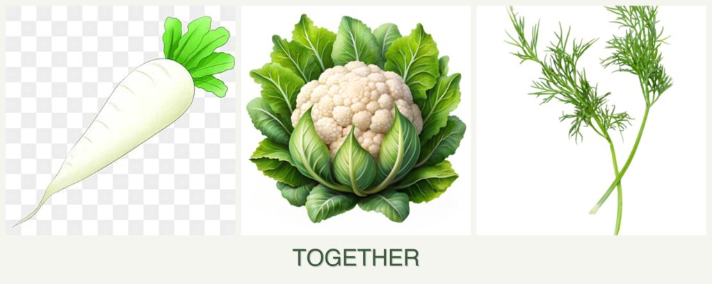 - Nutrient Needs: Radishes, cauliflower, and dill have different nutrient requirements and root depths, minimizing competition.