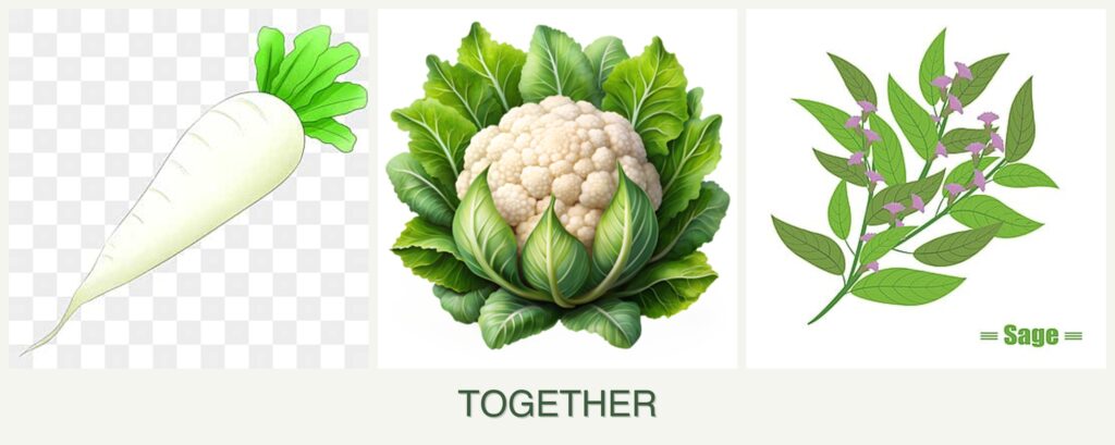 - Nutrient Needs: While radishes and cauliflower are heavy feeders, sage has modest nutrient requirements, reducing competition.