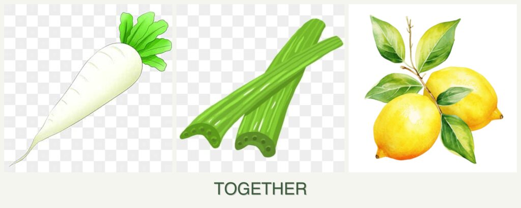 - Growth Requirements: Radishes and celery prefer cooler temperatures and can be grown in the same season, but lemons need a warm, consistent climate to thrive.