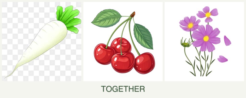 - Growth Requirements: Radishes thrive in cool weather, while cherries and cosmos prefer warmer conditions. This may require strategic timing in planting.