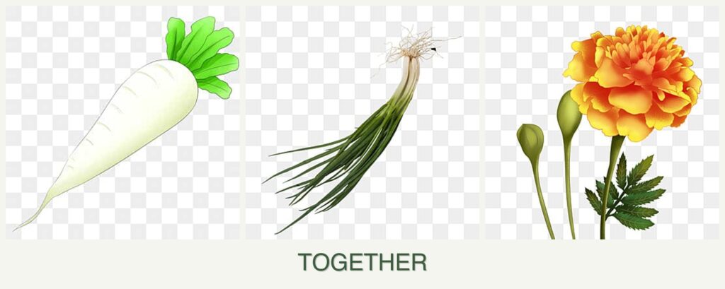 - Pest Repellent Properties: Chives and marigolds are known for their ability to repel pests like aphids and beetles, protecting radishes from potential damage.